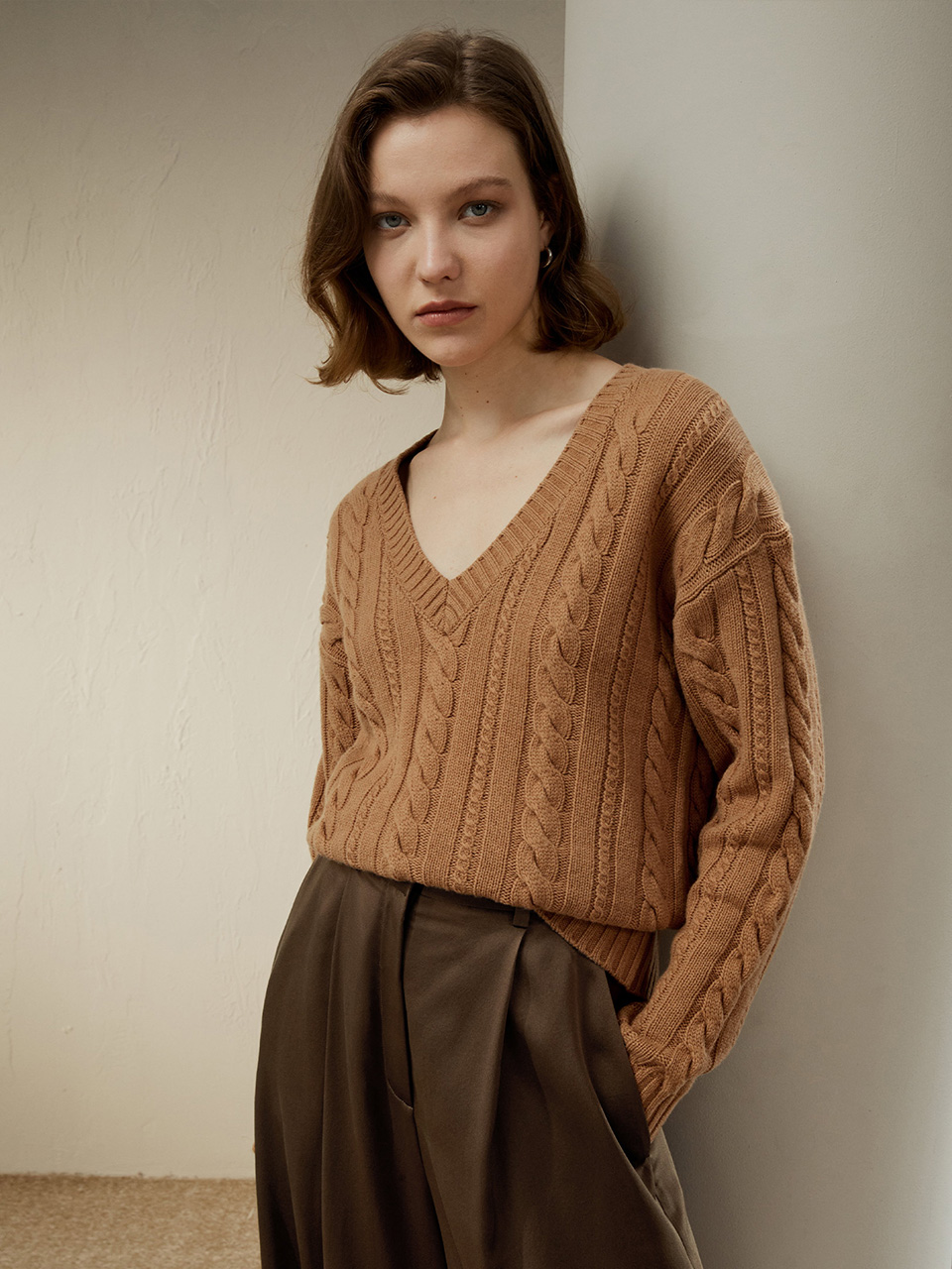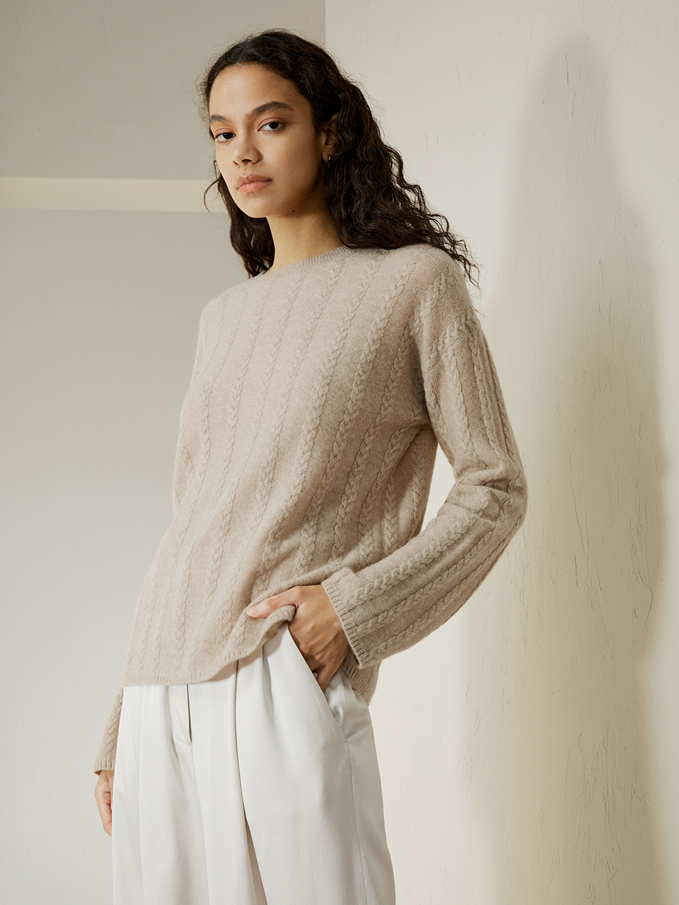 ケーブル編み クルーネック 英国調 ウール混カシミアセーター