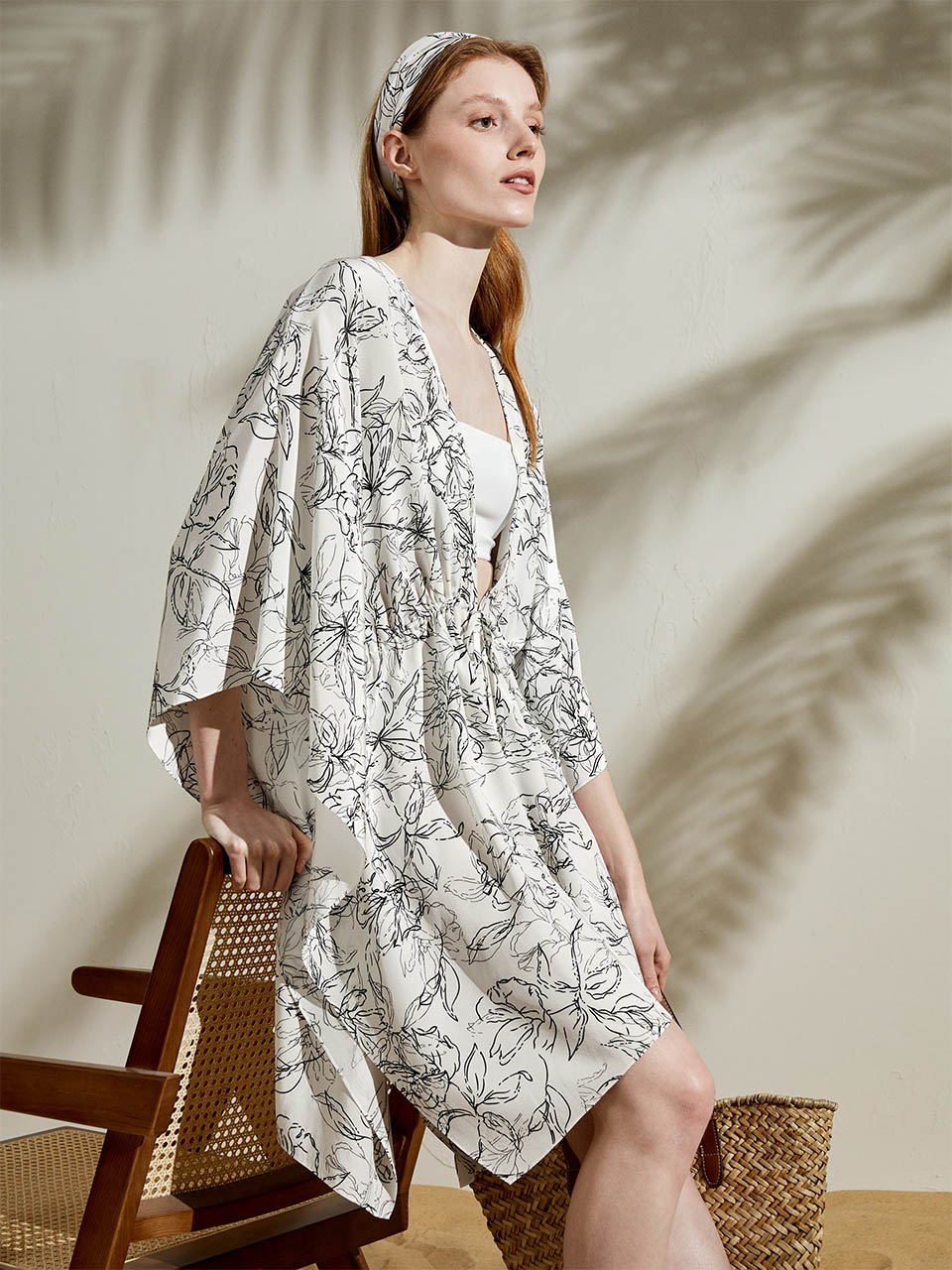 シルクの花柄ワンピースは自然な美しさを引き出し、海辺の風になびく姿がとても魅力的です。